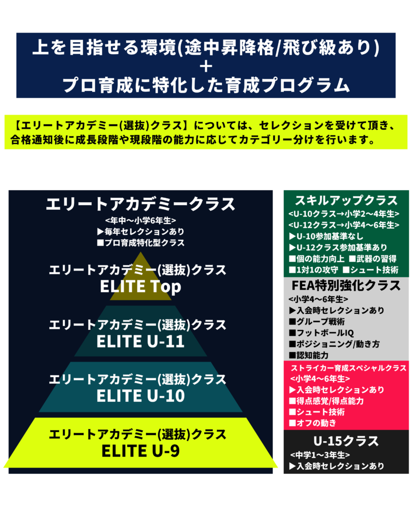 ■エリートアカデミークラス合格選手については、合格通知後に成長段階や現段階の能力に応じてカテゴリー分けを行います。