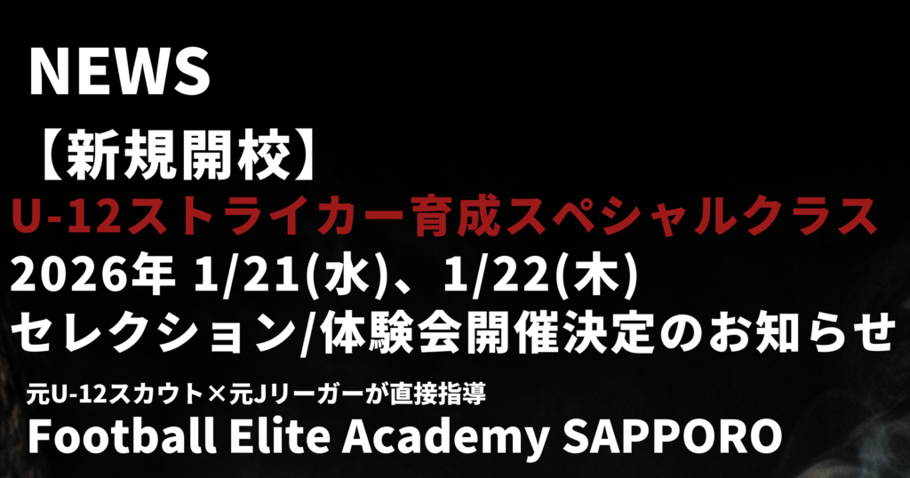 この度、FEA札幌サッカースクールでは、2026年2月より、小学4〜6年生(今回は3〜5年生募集)を対象とした「U-12ストライカー育成スペシャルクラス」を新規開校いたします。つきましては、1月21日(水)、1月22日(木)に選手募集セレクション/体験会を開催します... -